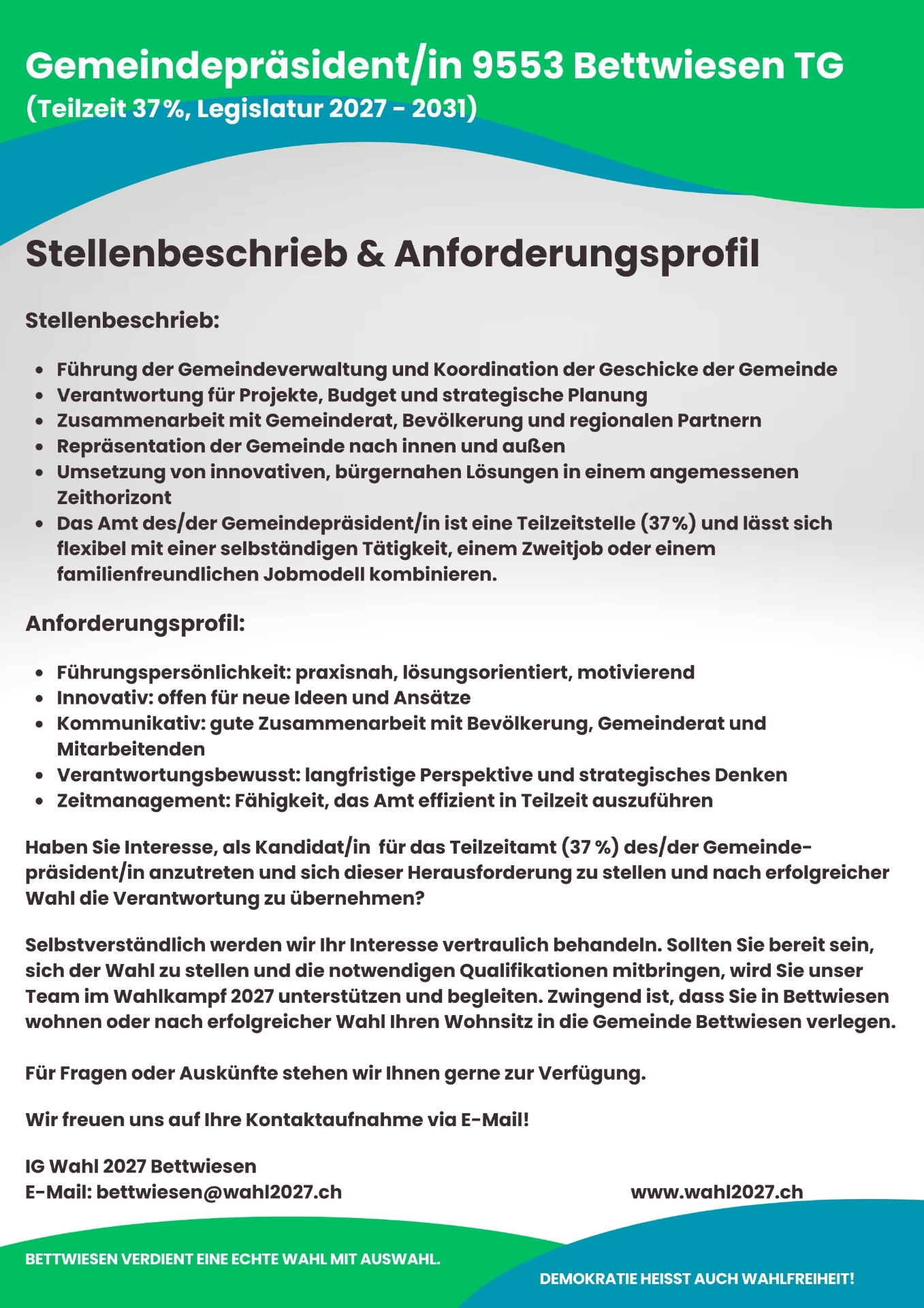 Für die Wahlen im Frühjahr 2027 suchen wir eine engagierte, innovative und bürgernahe Persönlichkeit für das Präsidium der Gemeinde Bettwiesen.